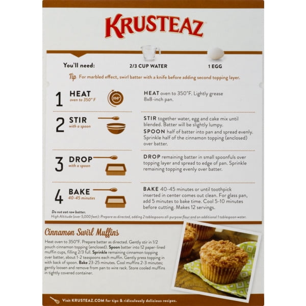 Krusteaz cinnamon crumb cake nutrition. Preheat oven to 350 degrees. 1 4 cup water 1 3 cup vegetable oil 4 eggs muffins. Where do the calories in krusteaz cinnamon swirl crumb cake muffin mix dry come from. What muffins and crumb cakes lack in frosting on top they make up for with delicious blueberries bananas and chocolate chips on the inside.